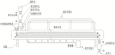 為物料的連續(xù)進出,采用雙級真空擋板閥裝置。該裝置由進料斗、緩沖倉、上真空擋板閥、暫存?zhèn)}、下真空擋板閥、接口等部分組成。同時,在進料端輔以電磁布料裝置,使物料均勻分布于傳送帶上。其動作過程為,初始狀態(tài)上、下真空擋板閥均閉合,物料經(jīng)進料斗進入緩沖倉,達到一定質量后,上真空擋板閥首先打開,物料進入緩沖倉,然后上真空擋板閥關閉,下真空擋板閥打開,物料經(jīng)接口進入設備內(nèi)部,下真空擋板閥關閉,完成一動作循環(huán),準備進入下一循環(huán)。輔助的布料裝置,了間隙時間內(nèi),物料的連續(xù)性。真空擋板閥采用電動控制,同時擋板上嵌有食品級硅橡膠密封材料用以真空密封,接口處有導電材料密封微波。